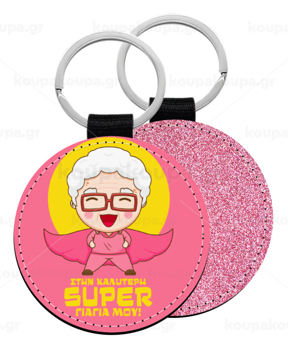 Στην καλύτερη Super γιαγιά μου!, Μπρελόκ Δερματίνη, στρογγυλό ΡΟΖ (5cm)