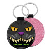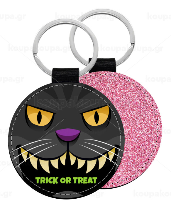 Halloween trick or treat Cat, Μπρελόκ Δερματίνη, στρογγυλό ΡΟΖ (5cm)