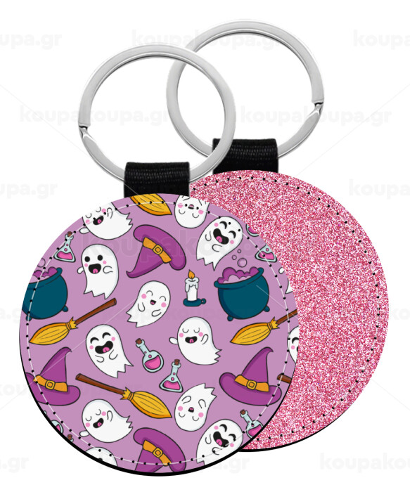 Happy Halloween pink, Μπρελόκ Δερματίνη, στρογγυλό ΡΟΖ (5cm)