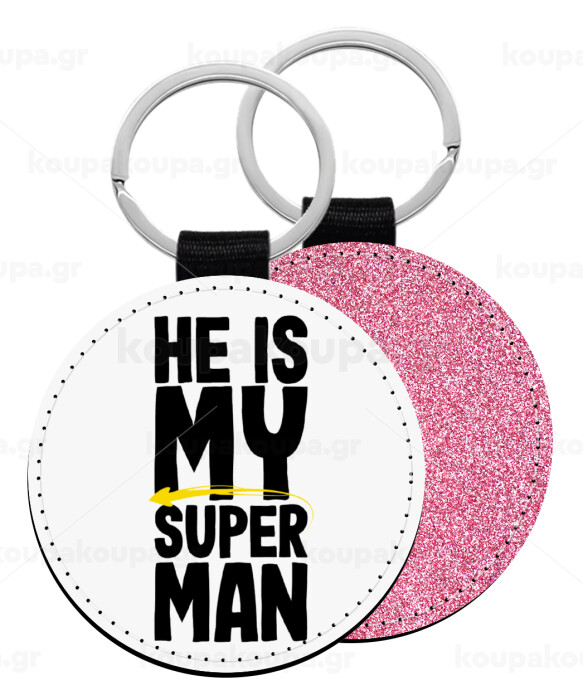 He is my superman, Μπρελόκ Δερματίνη, στρογγυλό ΡΟΖ (5cm)