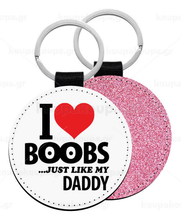 I Love boobs ...just like my daddy, Μπρελόκ Δερματίνη, στρογγυλό ΡΟΖ (5cm)