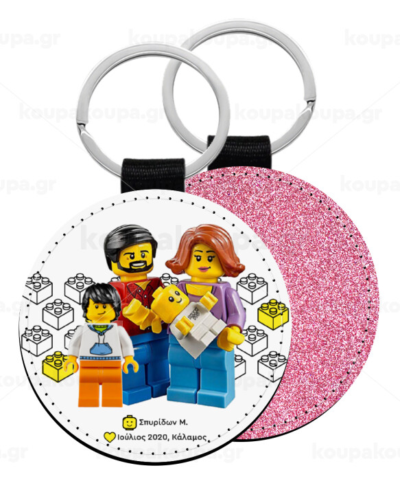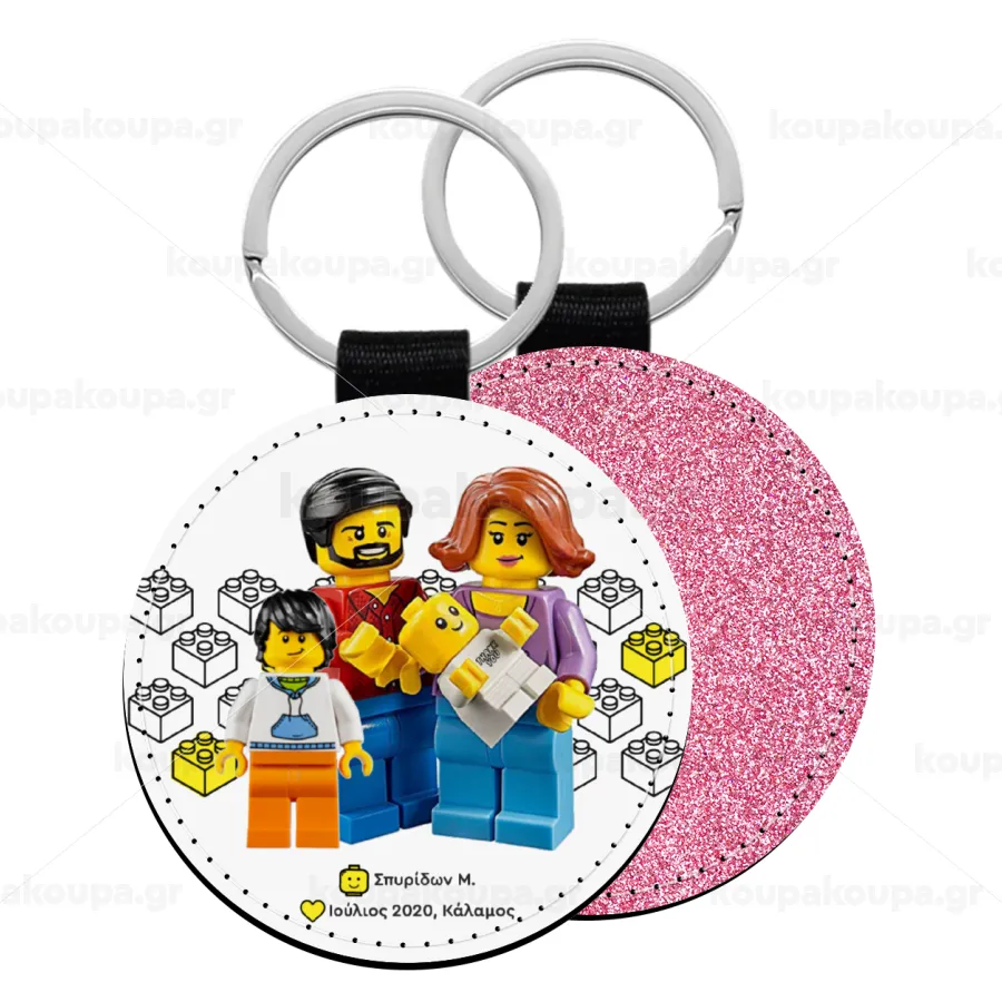 Τύπου Lego family, Μπρελόκ Δερματίνη, στρογγυλό ΡΟΖ (5cm)
