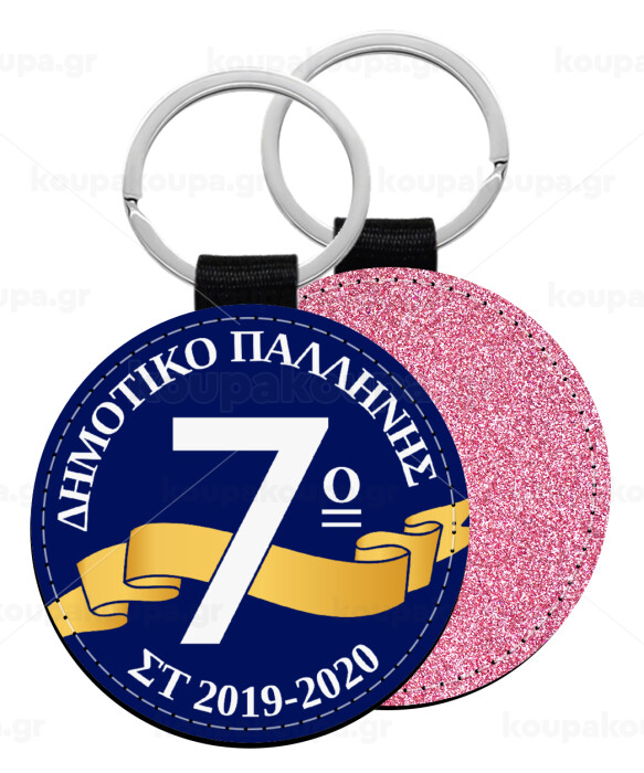 Σχολική μπλε με κορδέλα, Μπρελόκ Δερματίνη, στρογγυλό ΡΟΖ (5cm)