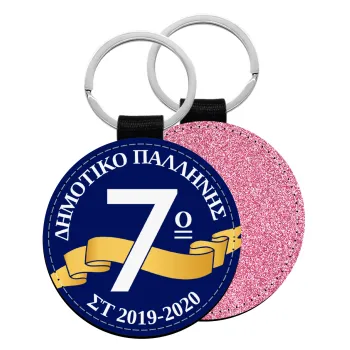 Σχολική μπλε με κορδέλα, Μπρελόκ Δερματίνη, στρογγυλό ΡΟΖ (5cm)