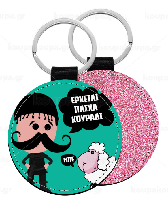 Κρητικός "Έρχεται Πάσχα κουράδι", Μπρελόκ Δερματίνη, στρογγυλό ΡΟΖ (5cm)