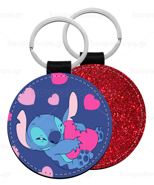 Lilo & Stitch hugs and hearts, Μπρελόκ Δερματίνη, στρογγυλό ΚΟΚΚΙΝΟ (5cm)