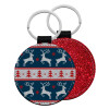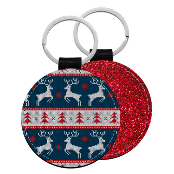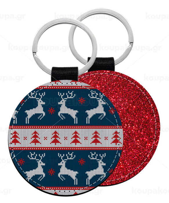 Χριστουγεννιάτικο πλεκτό ελάφια μπλε, Μπρελόκ Δερματίνη, στρογγυλό ΚΟΚΚΙΝΟ (5cm)