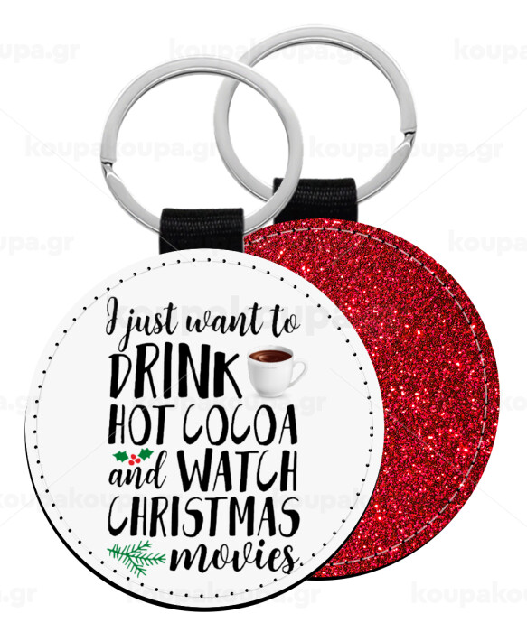 I just want to drink hot cocoa and watch christmas movies, Μπρελόκ Δερματίνη, στρογγυλό ΚΟΚΚΙΝΟ (5cm)