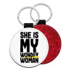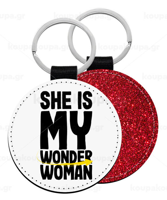She is my wonder woman, Μπρελόκ Δερματίνη, στρογγυλό ΚΟΚΚΙΝΟ (5cm)