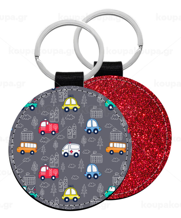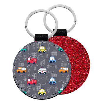 Hand drawn childish set with cars, Μπρελόκ Δερματίνη, στρογγυλό ΚΟΚΚΙΝΟ (5cm)