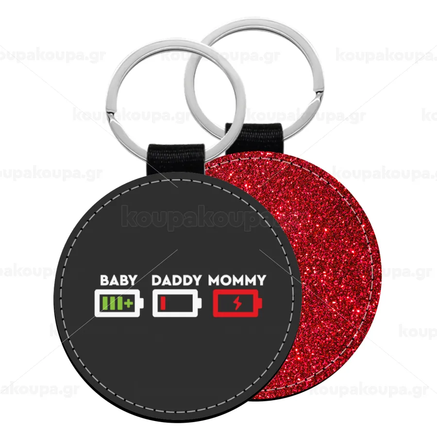 BABY, MOMMY, DADDY Low battery, Μπρελόκ Δερματίνη, στρογγυλό ΚΟΚΚΙΝΟ (5cm)