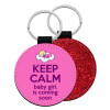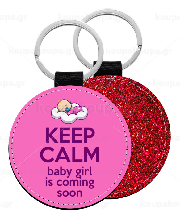 KEEP CALM baby girl is coming soon!!!, Μπρελόκ Δερματίνη, στρογγυλό ΚΟΚΚΙΝΟ (5cm)