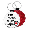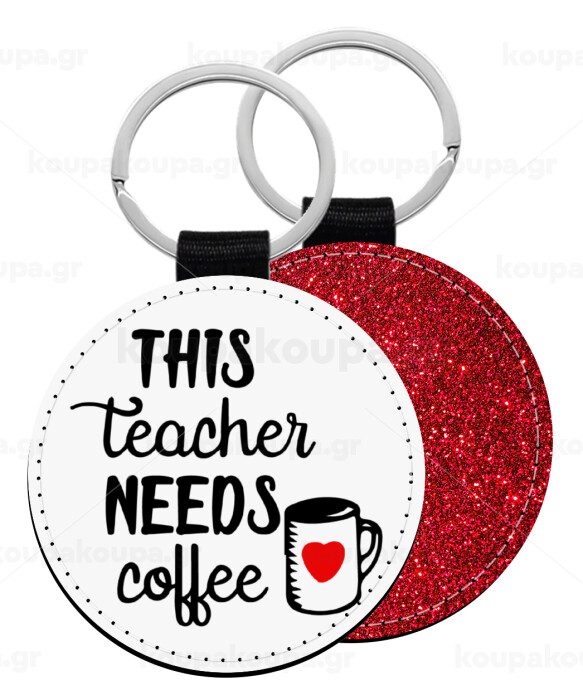 Τhis teacher needs coffee, Μπρελόκ Δερματίνη, στρογγυλό ΚΟΚΚΙΝΟ (5cm)