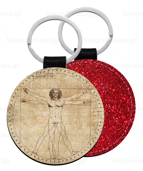 Leonardo da vinci Vitruvian Man, Μπρελόκ Δερματίνη, στρογγυλό ΚΟΚΚΙΝΟ (5cm)
