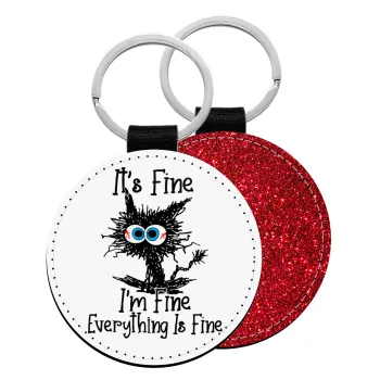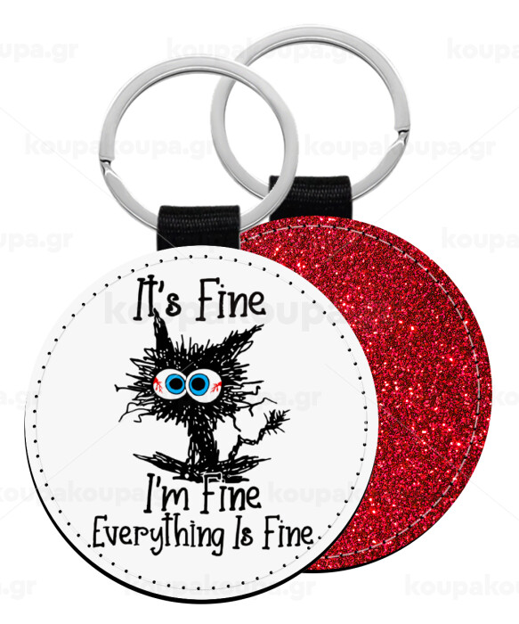 Cat, It's Fine I'm Fine Everything Is Fine, Μπρελόκ Δερματίνη, στρογγυλό ΚΟΚΚΙΝΟ (5cm)