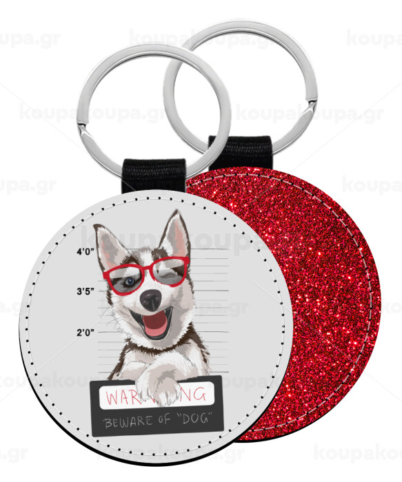 Warning, beware of Dog, Μπρελόκ Δερματίνη, στρογγυλό ΚΟΚΚΙΝΟ (5cm)