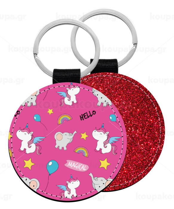 Mπρελόκ από δερματίνη με glitter στην μία πλευρά και στην άλλη δερματίνη μεγάλης αντοχής. Κρίκος ασφάλειας για τα κλειδιά.