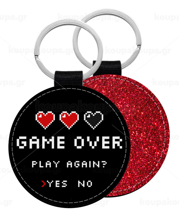 GAME OVER, Play again? YES - NO, Μπρελόκ Δερματίνη, στρογγυλό ΚΟΚΚΙΝΟ (5cm)