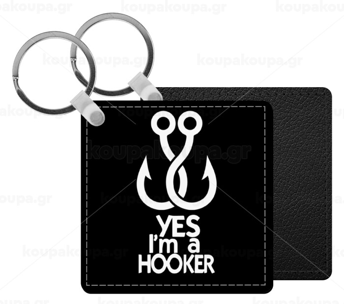 Yes i am Hooker, Μπρελόκ Δερματίνη, τετράγωνο ΜΑΥΡΟ (5x5cm)