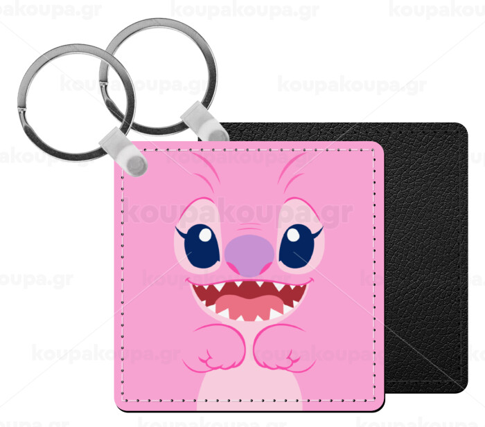 Lilo & Stitch Angel pink, Μπρελόκ Δερματίνη, τετράγωνο ΜΑΥΡΟ (5x5cm)