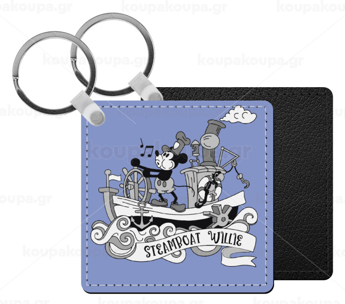 Mickey steamboat, Μπρελόκ Δερματίνη, τετράγωνο ΜΑΥΡΟ (5x5cm)