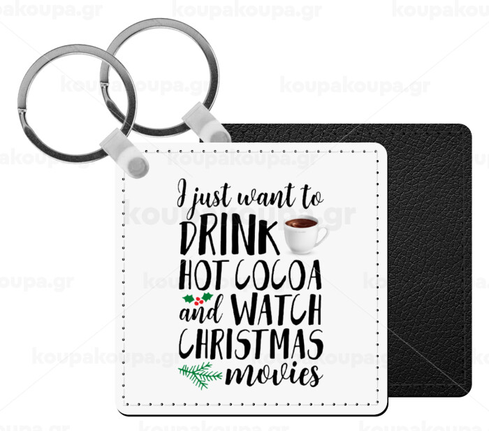 I just want to drink hot cocoa and watch christmas movies, Μπρελόκ Δερματίνη, τετράγωνο ΜΑΥΡΟ (5x5cm)