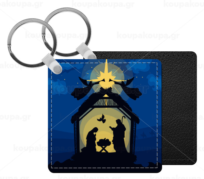 Η γέννηση του Ιησού φάτνη, Μπρελόκ Δερματίνη, τετράγωνο ΜΑΥΡΟ (5x5cm)