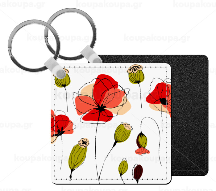 Red poppy flowers papaver, Μπρελόκ Δερματίνη, τετράγωνο ΜΑΥΡΟ (5x5cm)