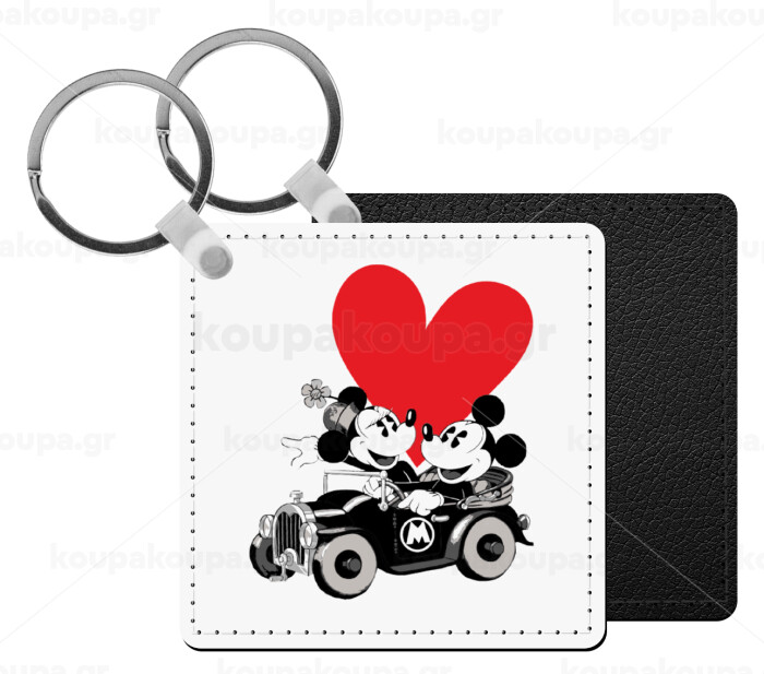 Mickey & Minnie love car, Μπρελόκ Δερματίνη, τετράγωνο ΜΑΥΡΟ (5x5cm)