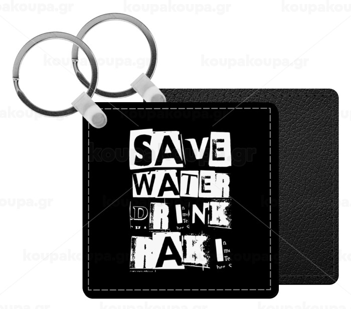 Save Water, Drink RAKI, Μπρελόκ Δερματίνη, τετράγωνο ΜΑΥΡΟ (5x5cm)