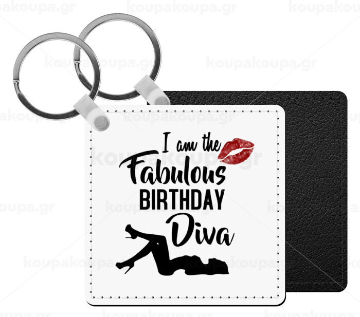 I am the fabulous Birthday Diva, Μπρελόκ Δερματίνη, τετράγωνο ΜΑΥΡΟ (5x5cm)