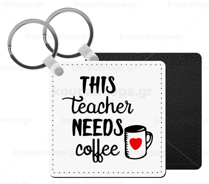Τhis teacher needs coffee, Μπρελόκ Δερματίνη, τετράγωνο ΜΑΥΡΟ (5x5cm)