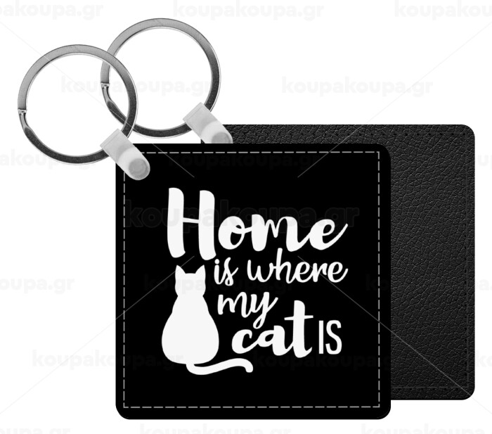 Home is where my cat is!, Μπρελόκ Δερματίνη, τετράγωνο ΜΑΥΡΟ (5x5cm)
