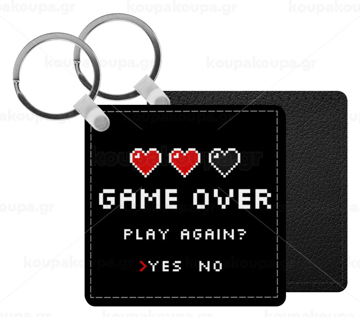 GAME OVER, Play again? YES - NO, Μπρελόκ Δερματίνη, τετράγωνο ΜΑΥΡΟ (5x5cm)