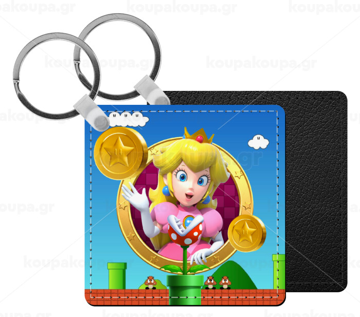 Princess Peach Toadstool, Μπρελόκ Δερματίνη, τετράγωνο ΜΑΥΡΟ (5x5cm)