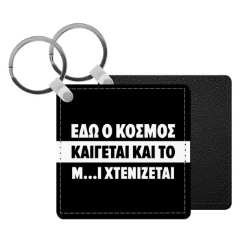 Εδώ ο κόσμος καίγεται και το Μ....Ι χτενίζεται, Μπρελόκ Δερματίνη, τετράγωνο ΜΑΥΡΟ (5x5cm)
