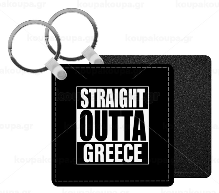 Straight Outta greece, Μπρελόκ Δερματίνη, τετράγωνο ΜΑΥΡΟ (5x5cm)