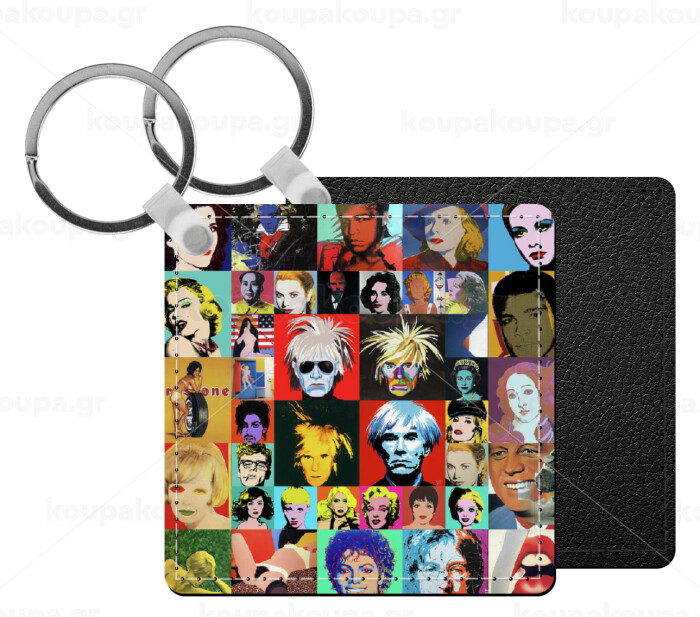 Warhol pop art, Μπρελόκ Δερματίνη, τετράγωνο ΜΑΥΡΟ (5x5cm)