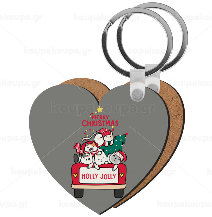 Merry Christmas cats in car, Μπρελόκ Ξύλινο καρδιά MDF