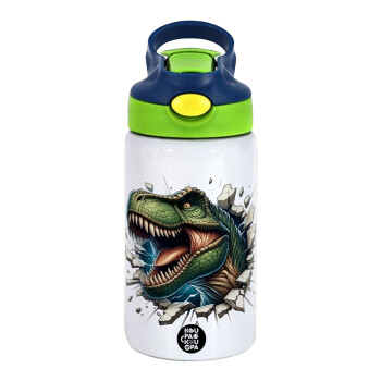 Dinosaur break wall, Παιδικό παγούρι θερμό, ανοξείδωτο, με καλαμάκι ασφαλείας, πράσινο/μπλε (350ml)