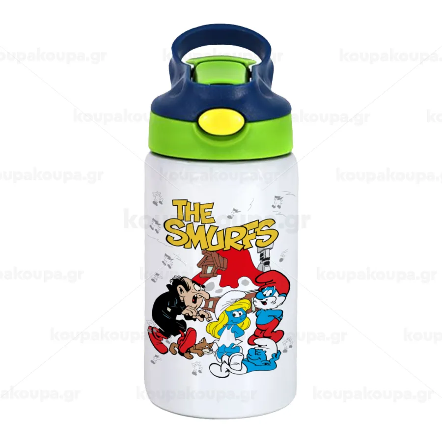 Τα στρουμφάκια, Παιδικό παγούρι θερμό, ανοξείδωτο, με καλαμάκι ασφαλείας, πράσινο/μπλε (350ml)