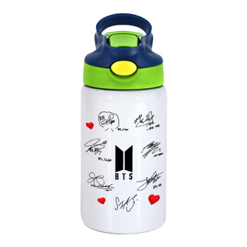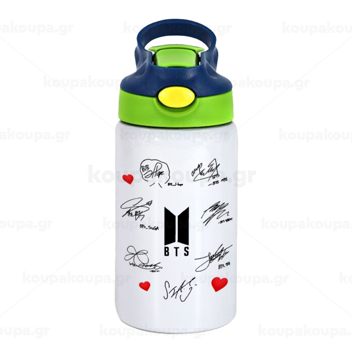 BTS signatures, Παιδικό παγούρι θερμό, ανοξείδωτο, με καλαμάκι ασφαλείας, πράσινο/μπλε (350ml)