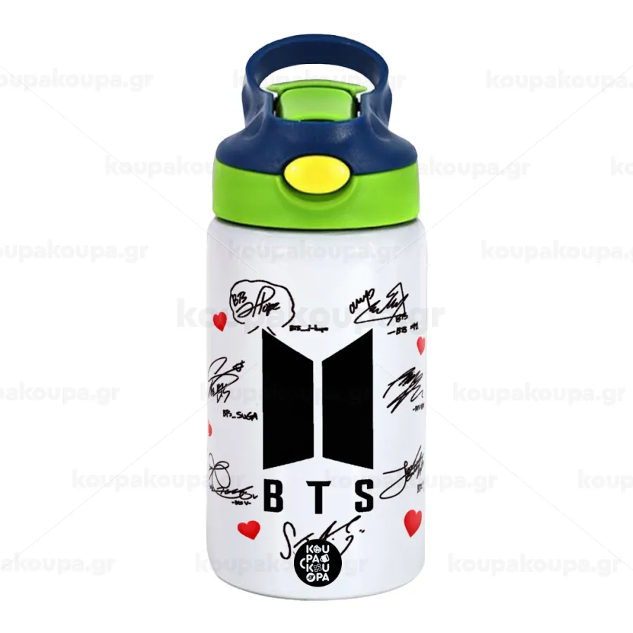 BTS signs, Παιδικό παγούρι θερμό, ανοξείδωτο, με καλαμάκι ασφαλείας, πράσινο/μπλε (350ml)