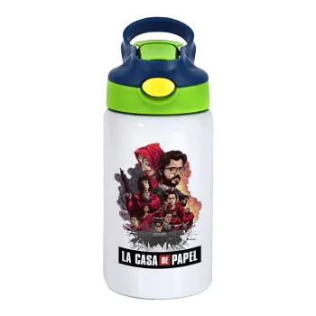 La casa de papel drawing cover, Παιδικό παγούρι θερμό, ανοξείδωτο, με καλαμάκι ασφαλείας, πράσινο/μπλε (350ml)