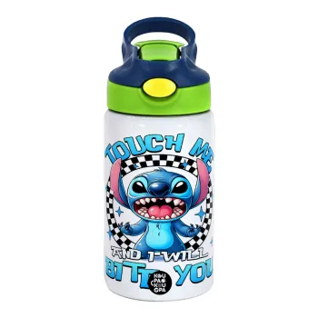 Stitch Touch Me And I Will Bite You, Παιδικό παγούρι θερμό, ανοξείδωτο, με καλαμάκι ασφαλείας, πράσινο/μπλε (350ml)