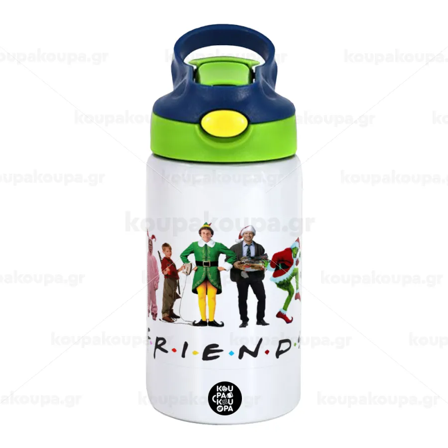 Christmas FRIENDS, Παιδικό παγούρι θερμό, ανοξείδωτο, με καλαμάκι ασφαλείας, πράσινο/μπλε (350ml)