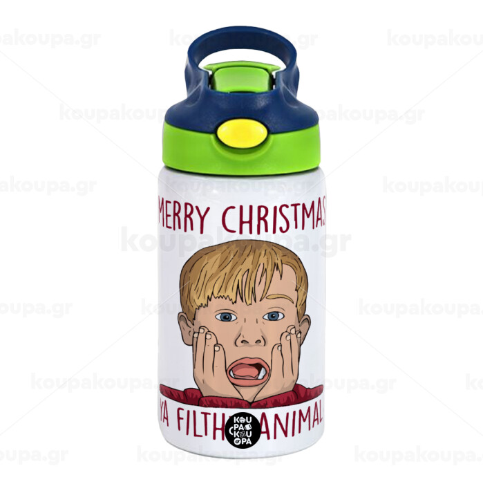 home alone, Merry Christmas ya filthy animal, Παιδικό παγούρι θερμό, ανοξείδωτο, με καλαμάκι ασφαλείας, πράσινο/μπλε (350ml)