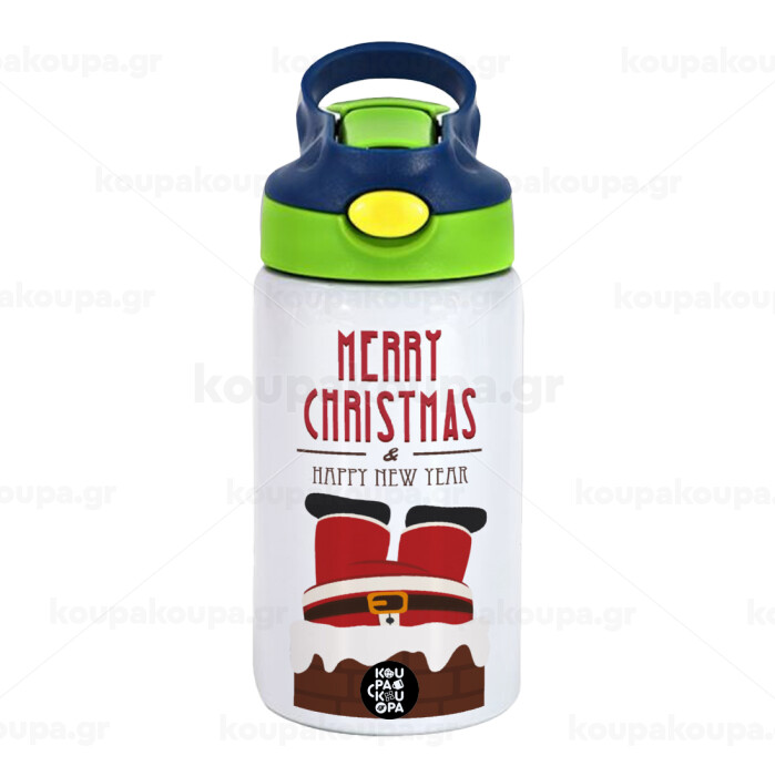 Merry christmas chimney, Παιδικό παγούρι θερμό, ανοξείδωτο, με καλαμάκι ασφαλείας, πράσινο/μπλε (350ml)