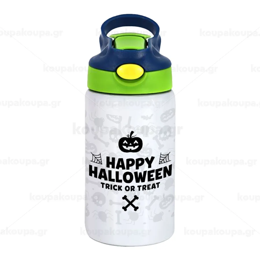 Happy Halloween pumpkin, Παιδικό παγούρι θερμό, ανοξείδωτο, με καλαμάκι ασφαλείας, πράσινο/μπλε (350ml)