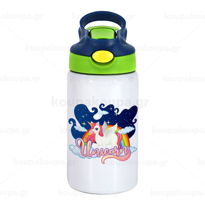 Μονόκερος, Παιδικό παγούρι θερμό, ανοξείδωτο, με καλαμάκι ασφαλείας, πράσινο/μπλε (350ml)